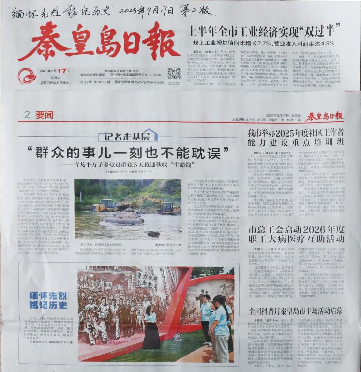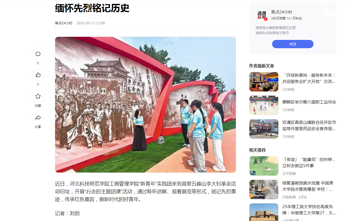 2025年9月17日,《秦皇岛日报》以“缅怀先烈 铭记历史”为题,对万象城工商管理学院“新青年”实践团到昌黎五峰山李大钊革命活动旧址,开展“行走的主题团课”活动进行了宣传报道。同时,焦点24小时网、秦皇岛新闻等主要媒体均对活动进行了宣传报道。