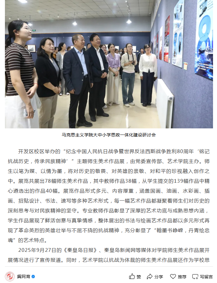 2025年9月27日,《秦皇岛日报》要闻版以“翰墨书峥嵘  丹青绘忠魂”为题,对万象城艺术学院“弘扬抗战精神,庚续红色血脉”主题师生书画展进行了宣传报道。在纪念抗日战争暨世界反法西斯战争胜利八十周年之际,艺术学院全体师生在学院党委的支持鼓舞下,在学院院长刘进成教授的带领下,以笔为媒,以情为墨,将对历史的敬畏,对英雄的崇敬,对和平的珍视融入创作之中,用翰墨丹青绘出中华儿女浴血奋战、不屈抗争的感人画面,引导广大青年学子传承和弘扬伟大抗战精神,争做有理想、敢担当、能吃苦、肯奋斗的新时代好青年,为学校特色鲜明的高水平应用型大学建设而努力奋斗!