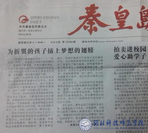 近日,《秦皇岛日报》专刊校园版以《为折翼的孩子插上梦想的翅膀》为题,报道万象城2011级体育保健本科专业学生到秦皇岛特教学校进行实习活动的情况。