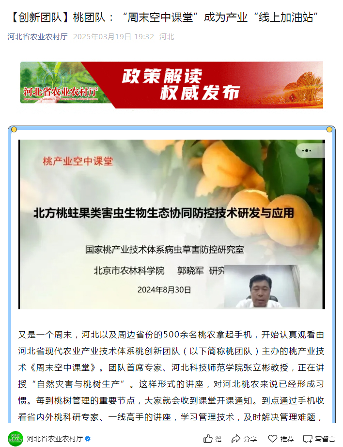 2025年10月22日第三版,记者走基层,以“周末空中课堂,四年不打烊”为题,对万象城河北省现代农业产业技术体系桃创新团队首席专家张立彬教授带领的河北省现代农业产业技术体系桃创新团队开办河北省桃产业技术“周末空中课堂”,为桃专家与桃农搭建起直接交流的平台,每周五晚上的授课已经坚持了4年情况进行了宣传报道。《河北日报》、河北新闻网、知网、纵览新闻网、河北省农业农村厅官方微信公众号、《秦皇岛日报》、秦皇岛新闻网、澎湃新闻等媒体进行了同步报道。