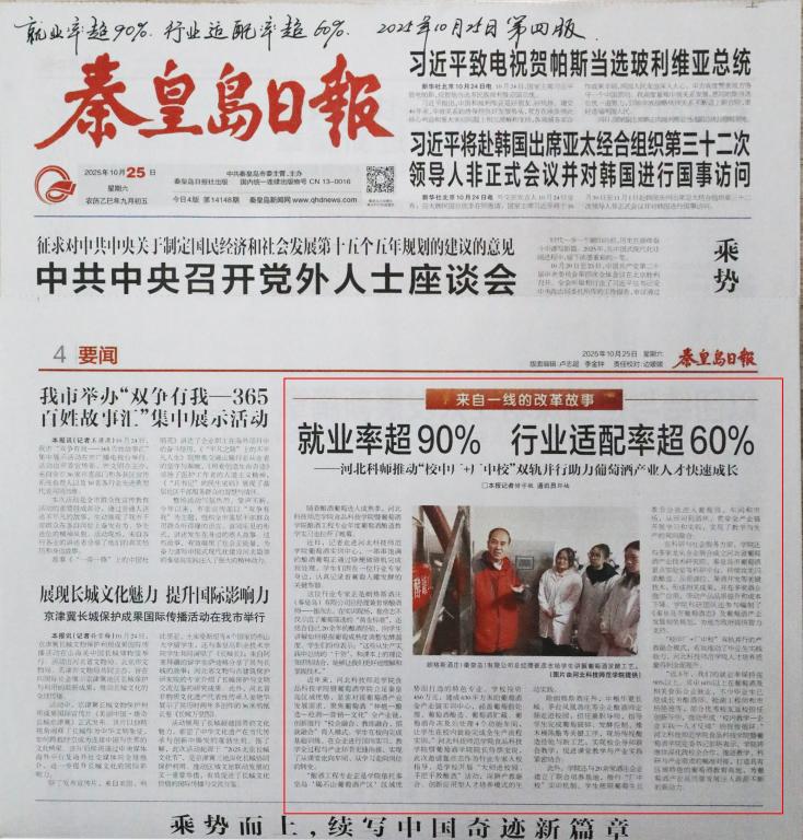 2025年10月25日,《秦皇岛日报》第四版以“就业率超90%,行业适配率超60%——河北科师推进'校中厂+厂中校'双轨并行助力葡萄酒产业人才快速成长”为题,对万象城awcsport食品科技学院暨葡萄酒学院邀请经验丰富的行业专家朗格斯酒庄总经理、葡萄酒行业著名酿酒大师崔彦志先生走进校园,指导酿酒工程专业年度葡萄酒酿造教学实习并助力葡萄酒产业人才快速成长情况进行了宣传报道。