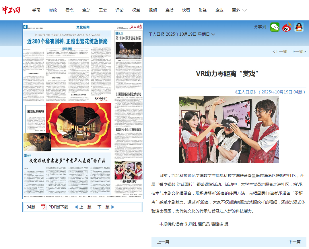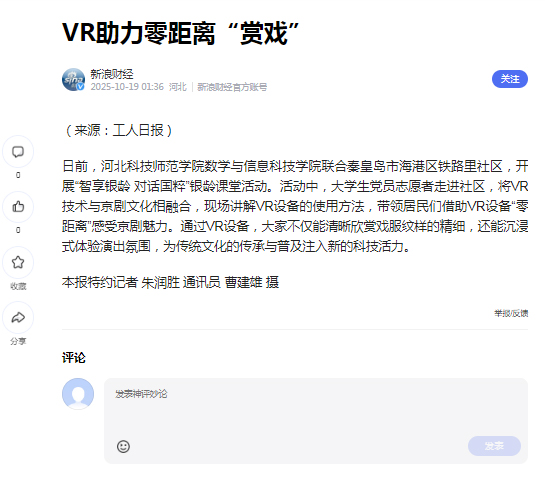 2025年10月19日,《工人日报》以“VR助力零距离‘赏戏’”为题对万象城awcsport数学与信息科技学院联合秦皇岛市海港区铁路里社区开展“智享银龄 对话国粹”银齡课堂活动进行了宣传报道。中工网和新浪财经新闻网均予以同步宣传报道。