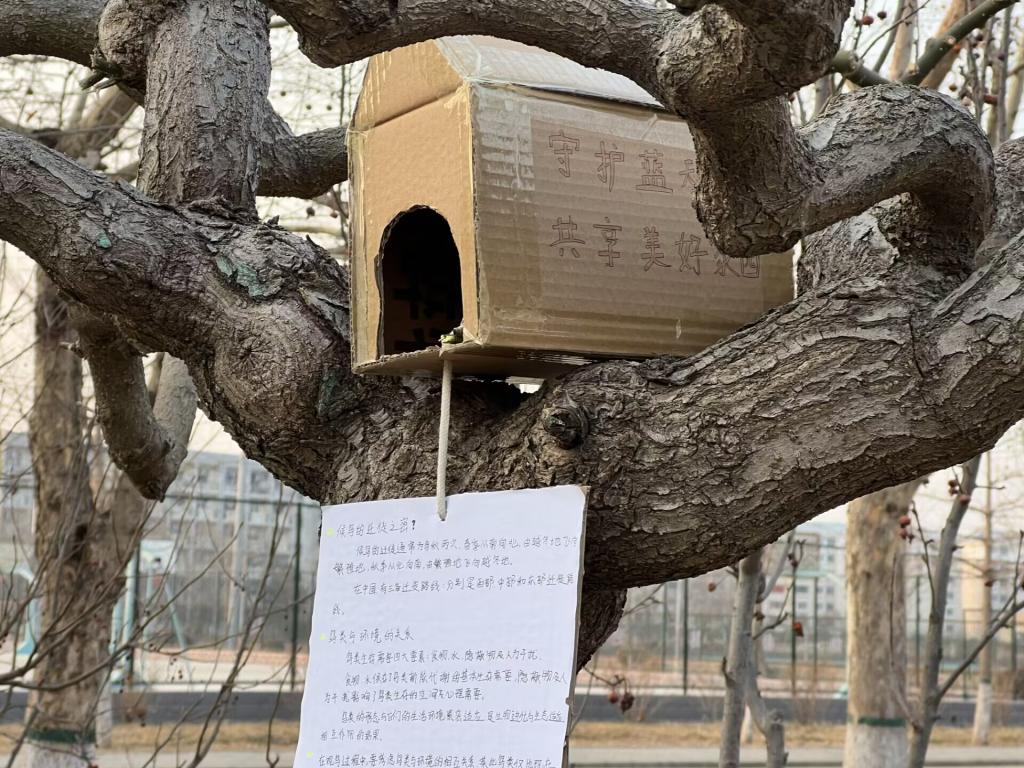 本次活动中,志愿者们利用树枝、木板等材料自制鸟巢,在纸板上进行绘画、写作来进行鸟类知识科普,志愿者们制作完成后将鸟巢放置在教学楼甬路的海棠树上,形成了一道独特的风景线。志愿者们在制作鸟巢的过程中贯彻环保原则,将关爱理念持续深入地传播至整个校园,号召更多师生加入到鸟类保护的大家庭中。