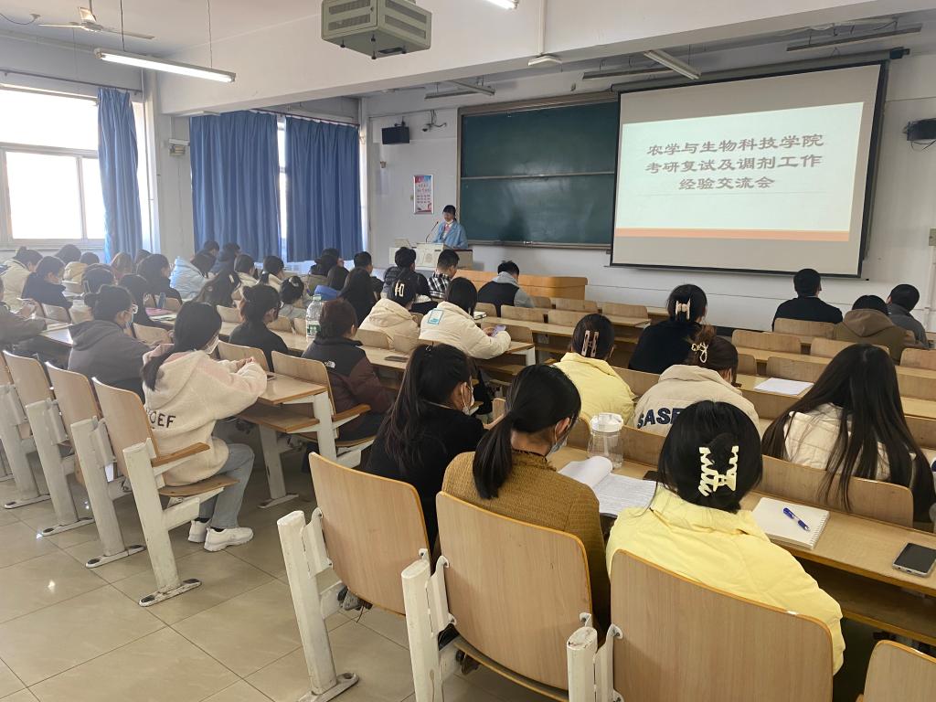 3月15日,农学与生物科技学院召开考研复试及调剂经验分享会,各教学部教师、毕业班班主任、共同为考研学生进行考研复试经验交流和调剂指导。