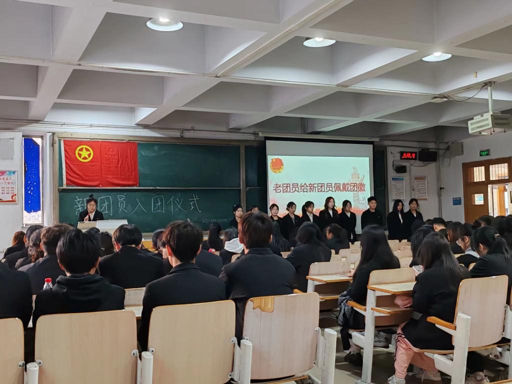 伴随着庄严的团歌《光荣啊,中国共青团》,活动正式拉开帷幕。首先,活动主持人为大家诠释了入团仪式的意义,宣读经个人申请,团支部推荐,团校学习、考核,上级审批通过的新团员名单。然后优秀团员代表给新团员佩戴象征着荣誉和使命的共青团团徽。新团员们面向团旗,在领誓人带领下举起右拳庄严宣誓,与会所有老团员们也共同重温入团誓词。