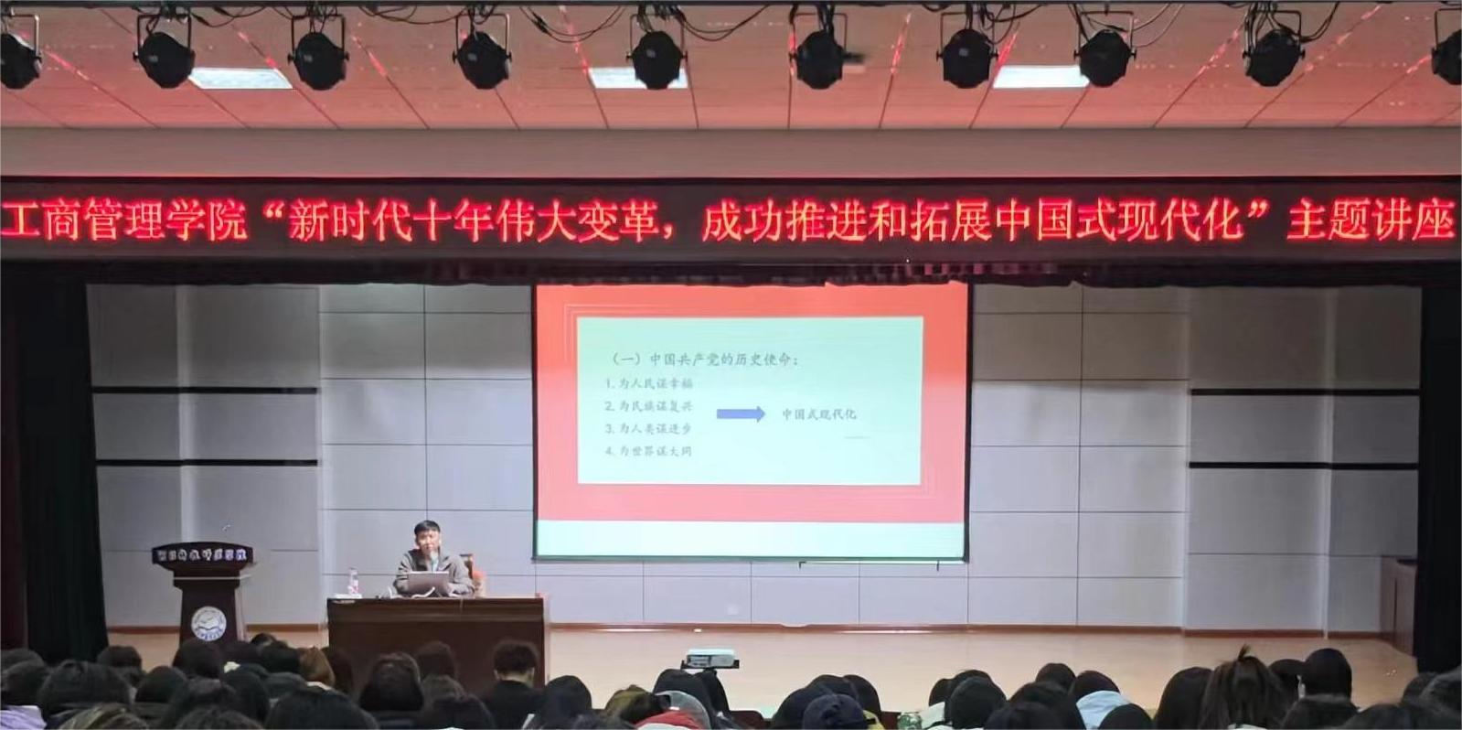 为深入学习贯彻党的二十大精神,提升团员青年的政治素养,2023年12月7日,工商管理学院邀请马克思主义学院高建超老师作“新时代十年伟大变革,成功推进和拓展中国式现代化”主题讲座。学院200余名学生参加此次讲座。