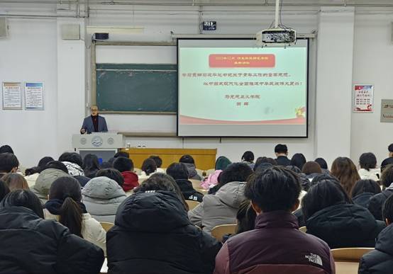 马克思主义学院教师田辉以“学习贯彻习近平总书记关于青年工作的重要思想,以中国式现代化全面推进中华民族伟大复兴”为题,讲述了党的十八大以来,习近平总书记关于青年工作的重要思想。然后从青年工作的地位作用、青年工作的目标任务、培养担当民族复兴大任的时代新人、把握青年一代健康成长的正确道路、拓展新时代青年的思想格局五个方面,对青年工作进行了深入浅出的讲解。
