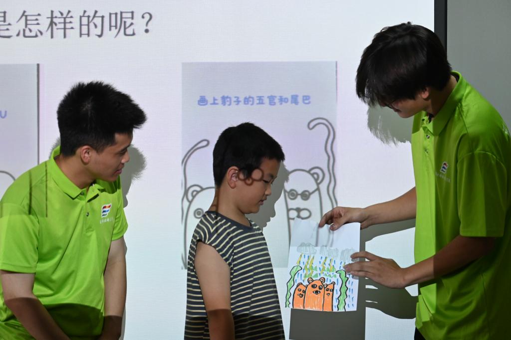 在燕大西苑社区,实践团开展了“变幻无穷的形象”、“动物的保护色”两节课程,带领孩子们感受物体形态和角度的变换,启发立体思维,让孩子们在描绘各种动物保护色的同时,领会人与自然和谐共生的道理,形成保护动物、保护自然的理念。