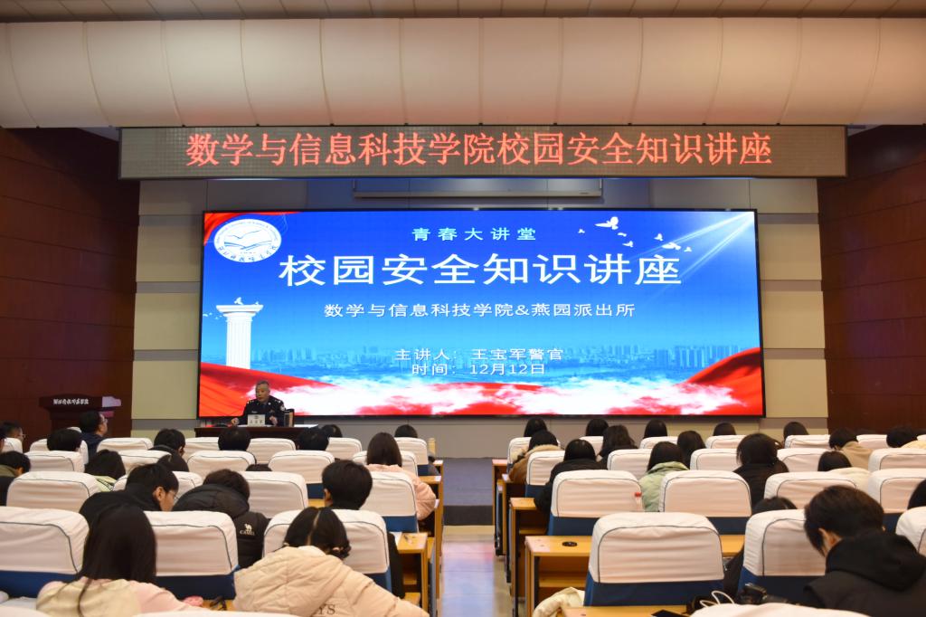 2024年12月12日,数学与信息科技学院邀请秦皇岛市公安局海港分局王宝军警官作为主讲人,在秦皇岛校区学术交流中心举办了一场校园安全知识讲座,学院专职辅导员及420余名学生参加了此次活动。