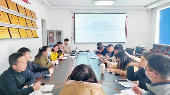 2025年3月13日,为深入贯彻落实“三全育人”理念,扎实推进学生关爱工作,根据学校相关工作精神,园艺科技学院召开了特殊关爱学生工作专题交流会。学生工作主管领导、教学秘书、全体专职辅导员、班主任共18人参加会议。
