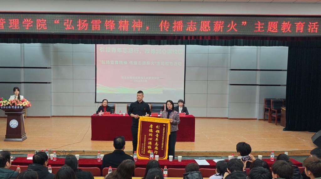 2025年3月13日,为弘扬“奉献、友爱、互助、进步”志愿精神,工商管理学院举办“弘扬雷锋精神 传播志愿薪火”主题教育活动。海港区文明实践科科长白彦彬、学院党政领导、党员教师和260余名学生参加了本次活动。