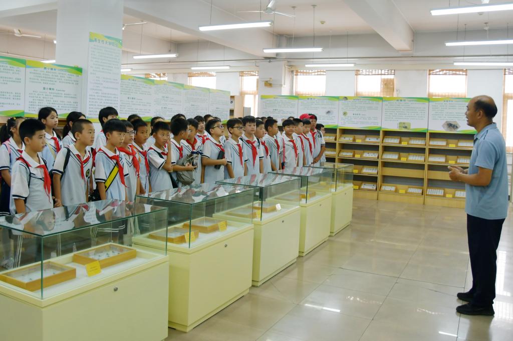 生物标本馆工作人员在冀东农林害虫天敌昆虫展厅为小学生讲解