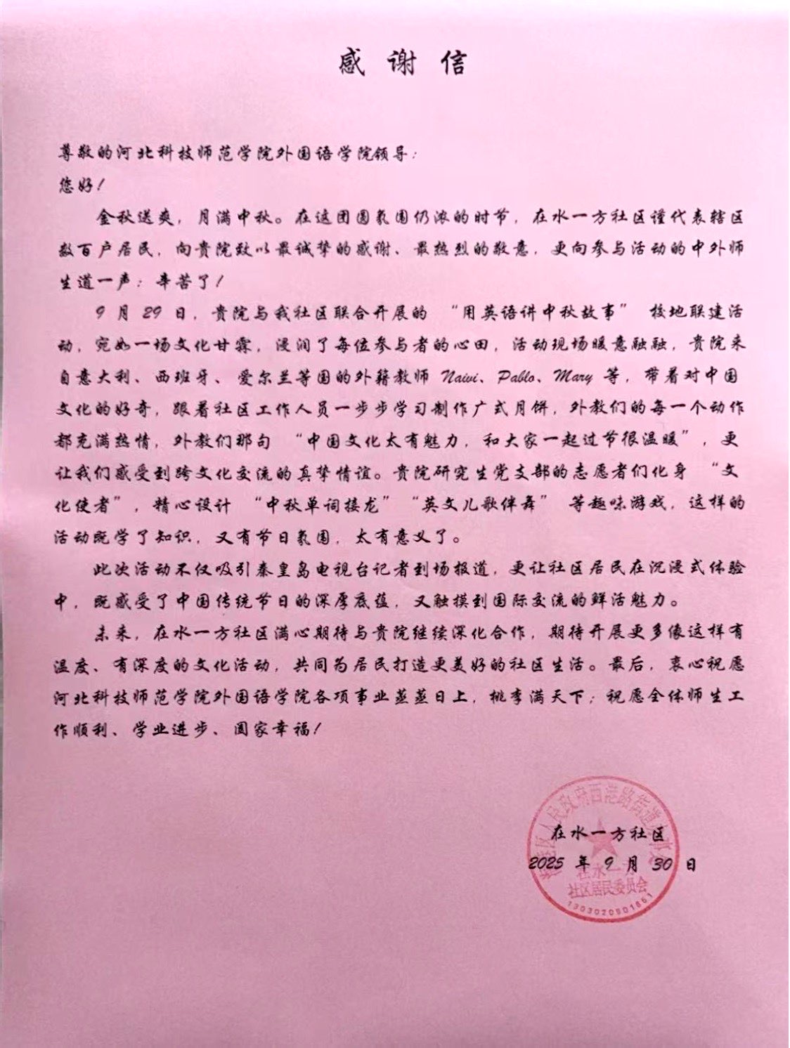 活动结束后,在水一方社区发来感谢信,既肯定了外国语学院师生为社区文化生活注入的活力,也点赞了活动 “以专业赋能文化传播” 的创新模式,称其 “让传统节日更有青春味,让中外交流更具烟火气”。这份认可不仅是对本次活动的肯定,更成为校地深化合作的纽带,为双方未来围绕文化传承、志愿服务等领域开展长效联动,搭建起更坚实的桥梁。