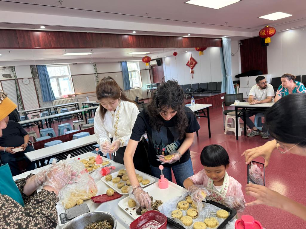 活动现场,来自意大利、西班牙、爱尔兰等国的学院外籍教师,首次体验广式月饼制作。在社区工作人员的指导下,外教们认真地揉面团、包馅料、压模具,看着自己制作的月饼慢慢成型,他们难掩兴奋,纷纷表示 “中国文化太有魅力了,能和孩子们一起参与这样的活动,感觉特别温暖”。与此同时,学院研究生党支部志愿者与社区幼儿园小朋友互动,用英语讲中秋由来,设计 “中秋单词接龙”“你唱我跳” 等游戏,孩子积极提问,现场满是欢声笑语。