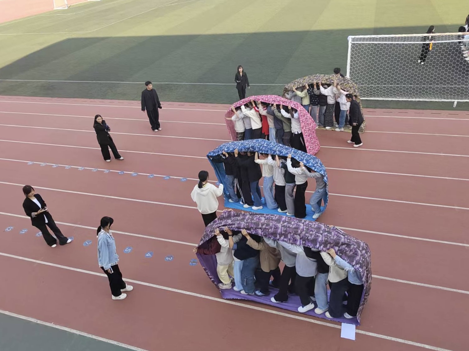 本次心理趣味赛采用团队形式参赛,每个团队10人。各团队分别完成“无间道”“无敌风火轮”“摸石过河”“多人多足”四个趣味项目,按照累计用时由少到多确定优胜团队。