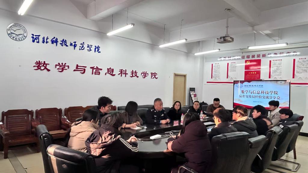 2025年12月10日,数学与信息科技学院反诈宣传员经验交流分享会在逸夫楼A1001召开。本次活动紧密响应秦皇岛市高校反诈先锋志愿服务联盟工作部署,旨在进一步深化校园反诈宣传教育成效,筑牢平安校园防护网。秦皇岛市海港分局王宝军警官、学院学生工作负责同志、全体专职辅导员及10名学生党员反诈宣传员参加分享会。
