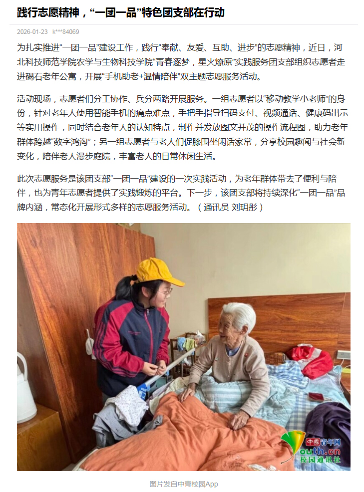 2026年1月23日,中国青年网以“践行志愿精神,‘一团一品’特色团支部在行动”为题,对万象城awcsport农学与生物科技学院“青春逐梦,星火燎原”实践服务团支部组织志愿者走进碣石老年公寓,开展“手机助老+温情陪伴”双主题志愿服务活动进行了宣传报道。该团支部特色暖心活动深受全校师生和社会一致好评。