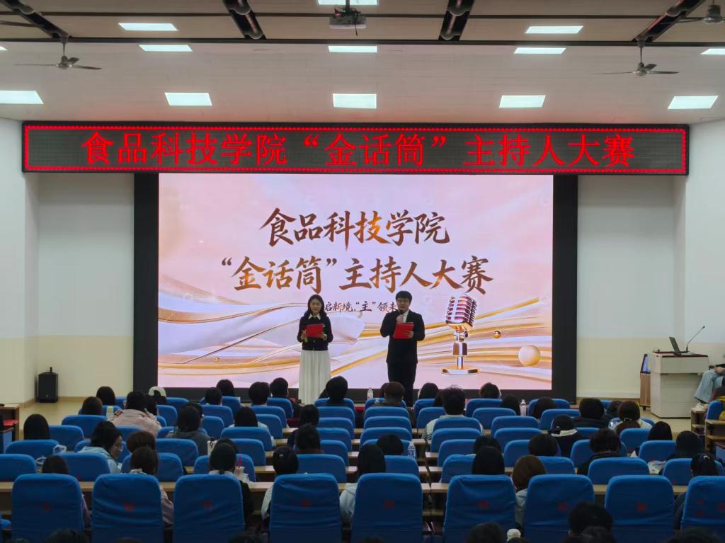 2026年3月31日,食品科技学院举办“金话筒”主持人大赛。大赛以“声启新境,‘主’领未来”为主题,面向全院学生开展,旨在提升学生语言表达、舞台主持与临场应变能力,发掘校园主持新星。