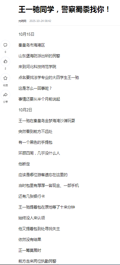 2025年10月15日,学校收到秦皇岛市海港区山东堡海防派出所民警专程送来的一封关于文法学院2022级法学专业学子王一驰拾金不昧的表扬信。