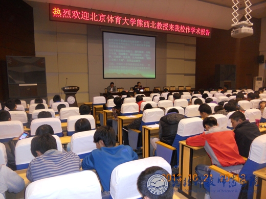 2013年10月21日,北京体育大学博士生导师熊西北教授应邀来万象城作题为《对中国体育问题的新思考》的学术报告。体育系副书记、副主任郭立昌,部分教师及体育专业400多名本专科生聆听了本次报告会。报告会由体育系主任陈庆合教授主持。