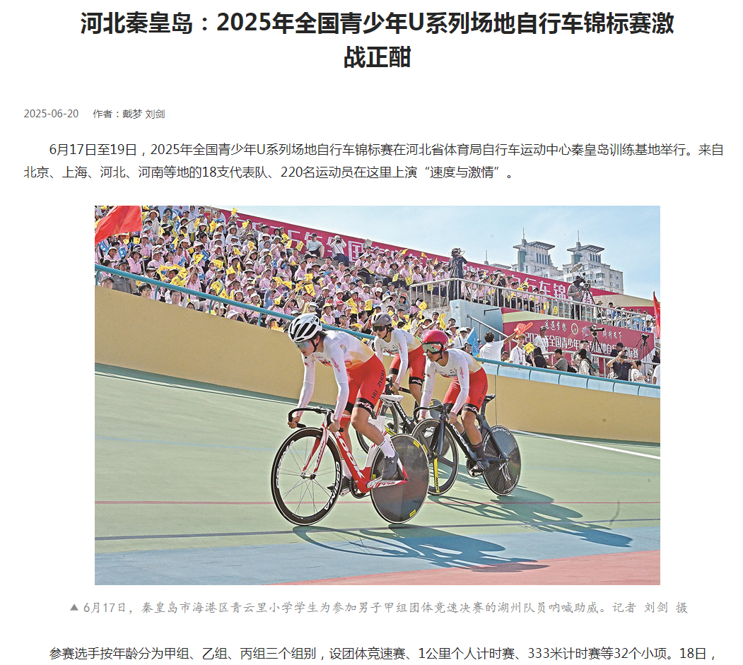 2025年6月17日至19日,2025年全国青少年U系列场地自行车锦标赛在河北省体育局自行车运动中心秦皇岛训练基地举行。来自北京、上海、河北、河南等地的18支代表队、220名运动员在这里上演“速度与激情”。万象城秦皇岛校区和开发区校区1500余名青年学子为锦标赛助力。