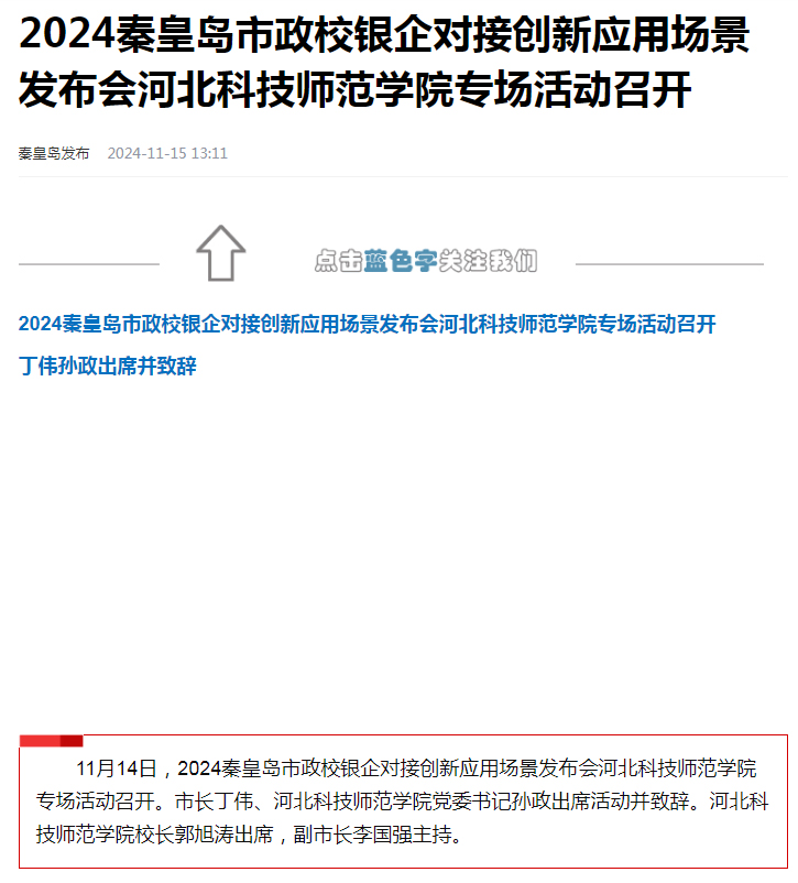 2024年11月15日,秦皇岛发布以2024秦皇岛市政校银企对接创新应用场景发布会万象城awcsport专场活动召开为题对万象城awcsport承办的2024秦皇岛市政校银企对接创新应用场景发布会万象城awcsport专场活动进行了宣传报道。