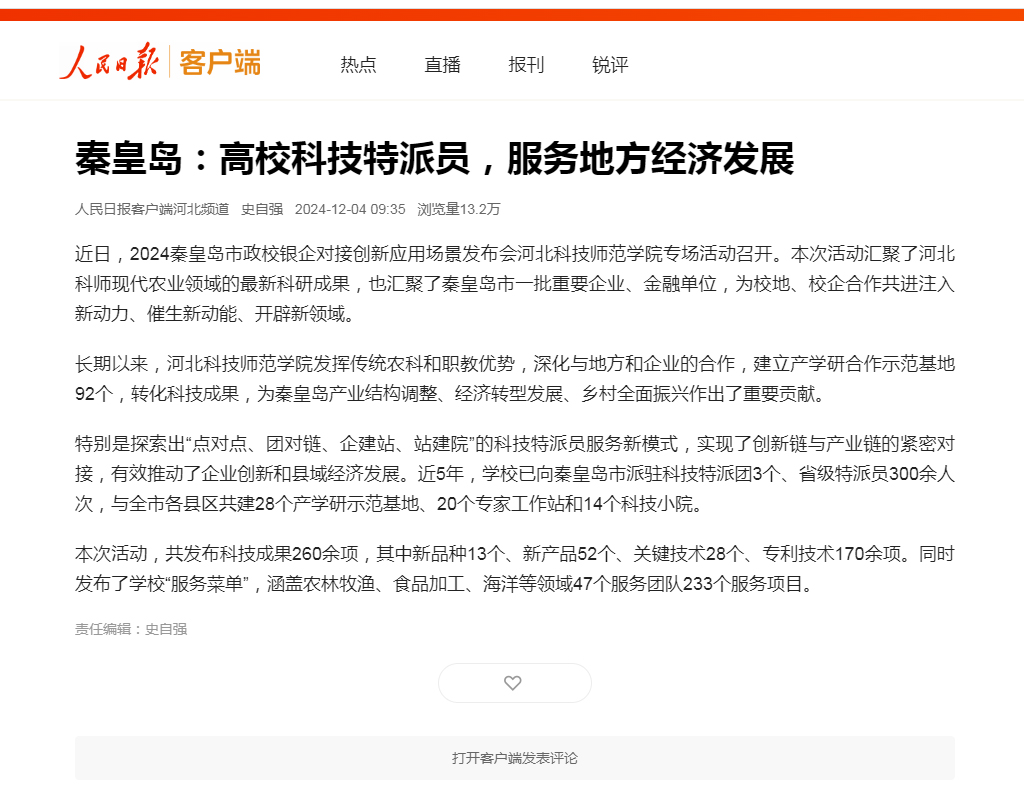 2024年12月4日,人民日报客户端河北频道以高校科技特派员服务地方经济发展为题,对万象城awcsport科技特派员服务地方经济社会发展,2024秦皇岛市政校银企对接创新应用场景发布会万象城awcsport专场活动情况进行了宣传报道。