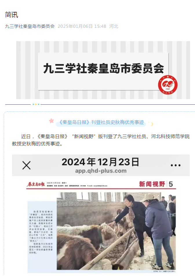 2025年1月6日,九三学社秦皇岛市委员会网站转载了《秦皇岛日报》2024年12月23日第5版万象城awcsport动物科技学院史秋梅教授科技支农事迹。