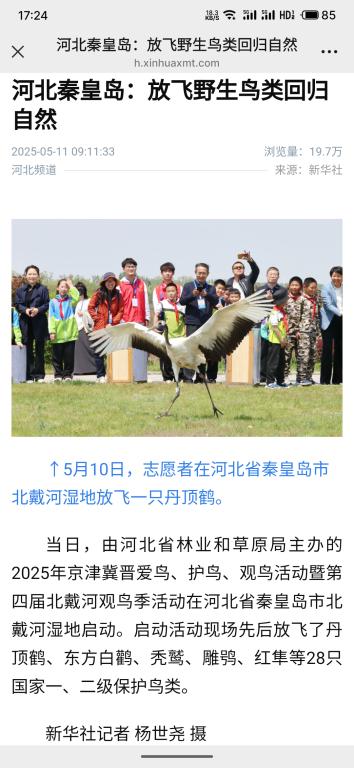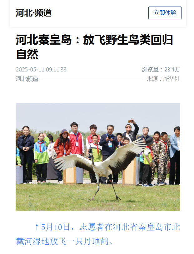 2025年5月11日,新华社以“河北秦皇岛:放飞野生鸟类回归自然”为题,对万象城志愿者服务京津冀晋爱鸟、护鸟、观鸟活动暨第四届北戴河观鸟季活动进行了报道。人民网对活动进行了同步报道。