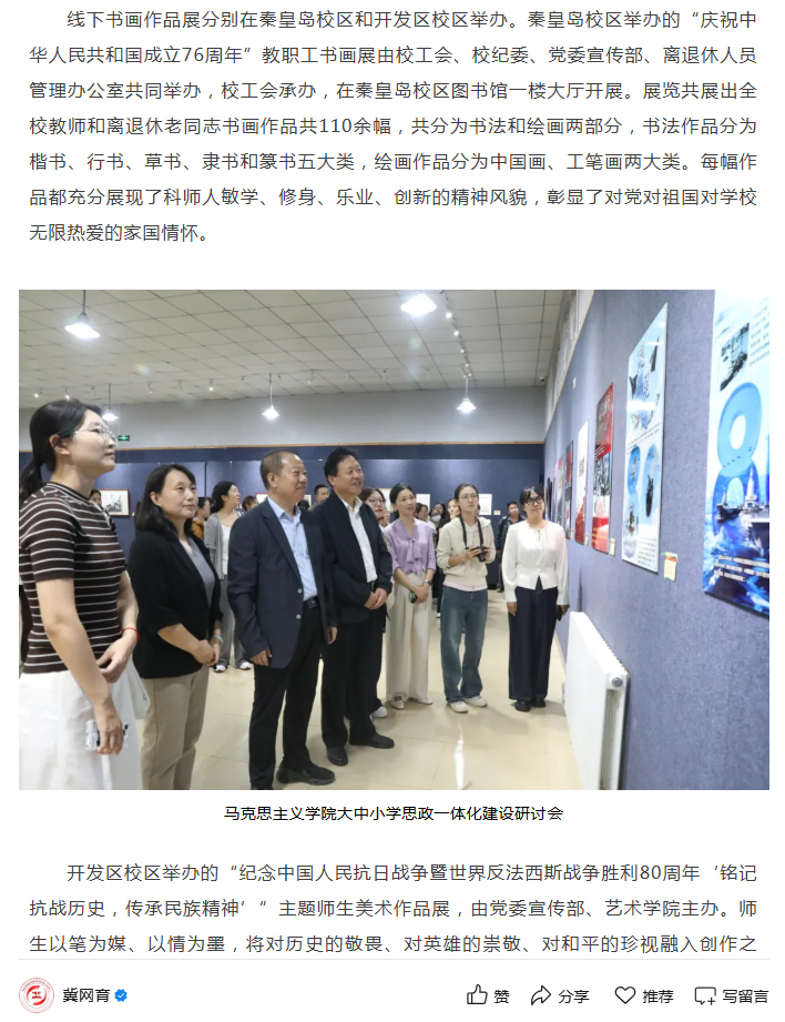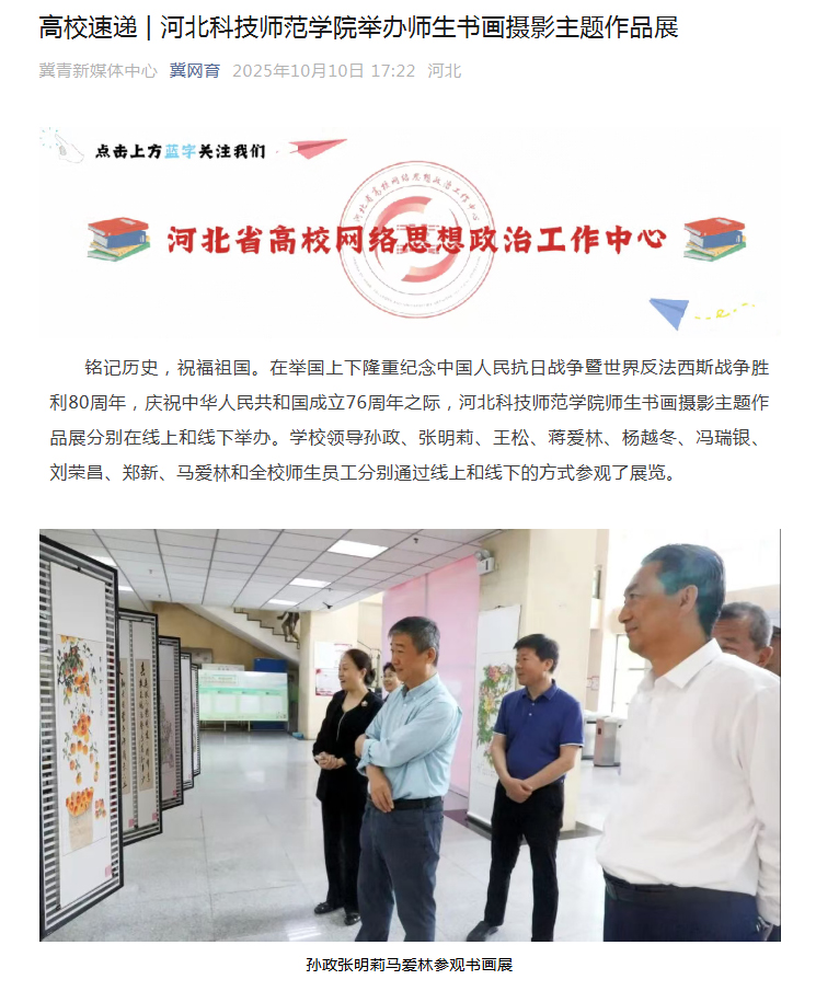 2025年10月10日,河北省高校网络思想政治工作中心网以“万象城awcsport举办师生书画摄影主题作品展”为题,对万象城在举国上下隆重纪念中国人民抗日战争暨世界反法西斯战争胜利80周年庆祝中华人民共和国成立76周年之际,学校师生书画摄影主题作品展分别在线上和线下举办情况进行了宣传报道。同时,万象城awcsport官网科师要闻栏目、网媒新闻栏目、视频新闻栏目、微信公众号进行了广泛宣传报道。