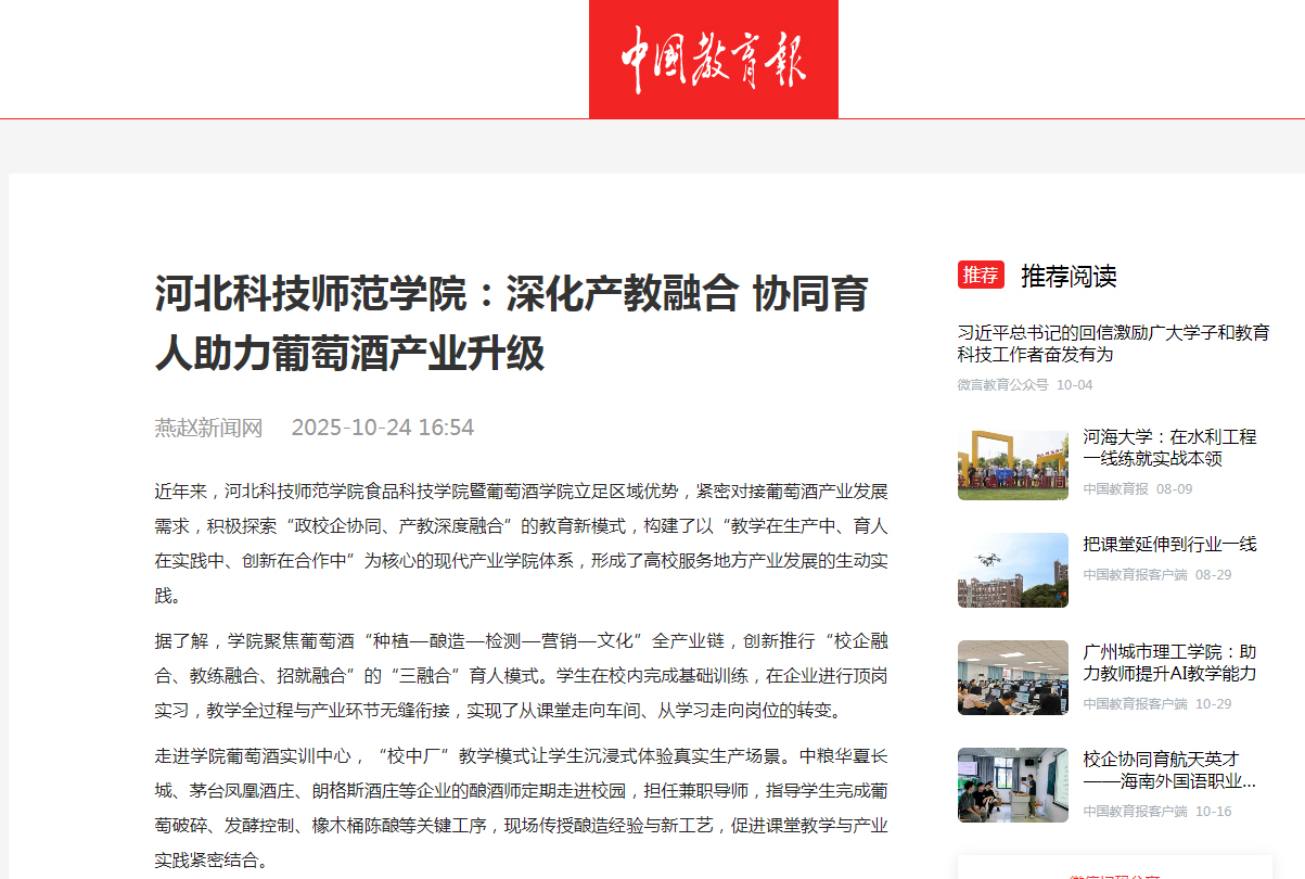 2025年10月24日,《中国教育报》燕赵新闻网以“万象城awcsport:深化产教融合 协同育人助力葡萄酒产业升级”万象城awcsport食品科技学院暨葡萄酒学院立足区域优势,紧密对接葡萄酒产业发展需求,积极探索“政校企协同、产教深度融合”的教育新模式,构建了以“教学在生产中、育人在实践中、创新在合作中”为核心的现代产业学院体系,形成了高校服务地方产业发展的生动实践情况进行了宣传报道。